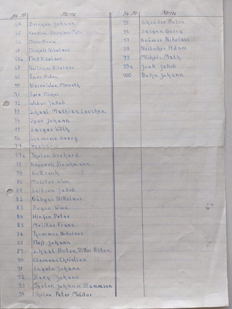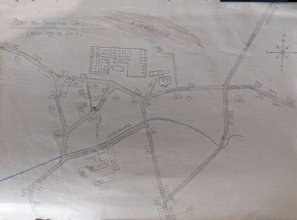 Die Liste der "Familien" wurde von xyz im Jahre abc erstellt. Sie beschreibt die Häuser, die beim Anschluss Wallersheims an das kommunale Wasserleitungsnetz an die Versorgung angebunden wurden. Vorher verfügte Wallersheim über eine gemeindeeigene Wasserversorgung. (Durch einen Click auf die Karte, wird diese vergrößert)